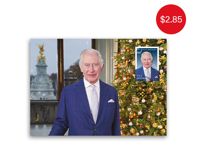 This is the second Australian issue honouring the birthday of King Charles III. It features a photographic portrait of Charles taken in December 2023 during the recording of His Majesty’s Christmas message at Buckingham Palace. The Royal Christmas message is a much-loved tradition, first broadcast on radio in 1932 by George V. In 2023, Charles’ Christmas message to the United Kingdom and the Commonwealth communicated his personal sentiments, including his hopes for world peace and our shared obligations to protect the Earth and the natural world.