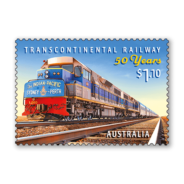 The Transcontinental Railway: 50 Years stamp depicts the inaugural Indian-Pacific passenger train with the Western Australian L class diesel-electric locomotives.